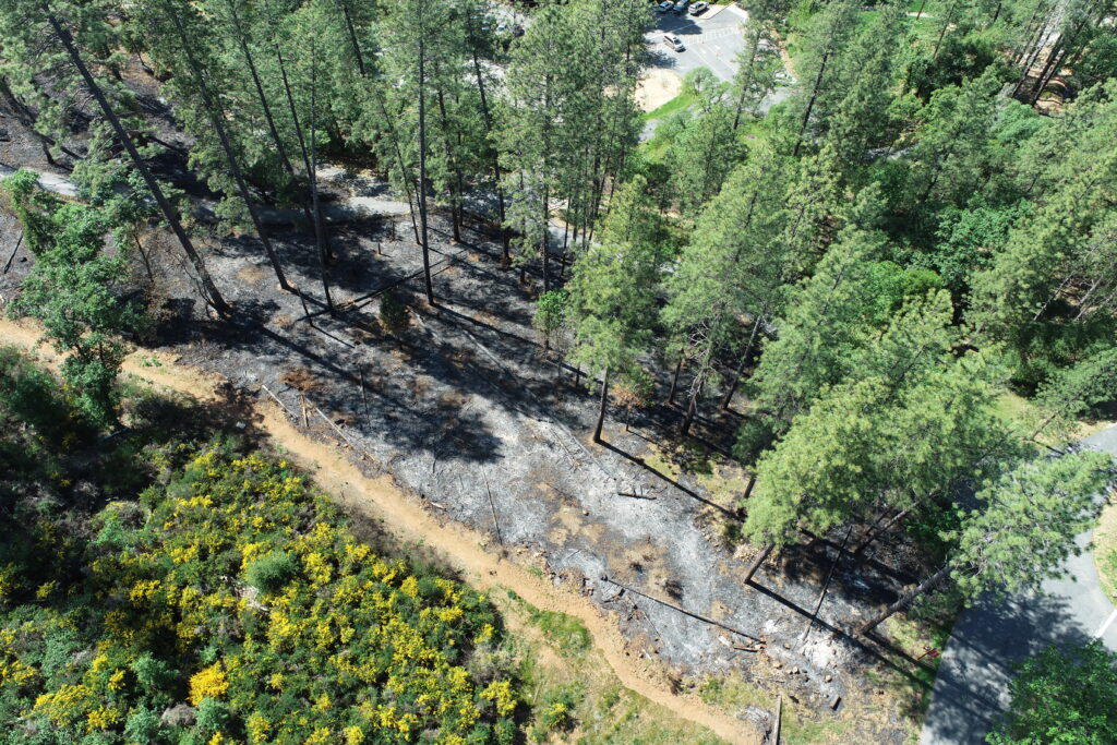 Drone footage of a post burn site at Nevada City School of the Arts (Kocin Pakan). Note the unburned Scotch Broom on the lower left of the photo.