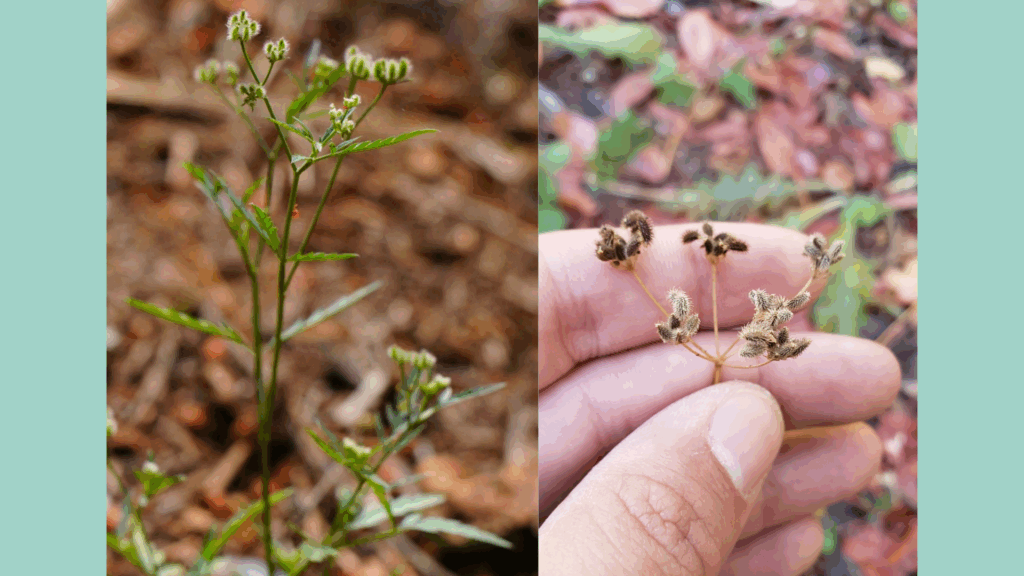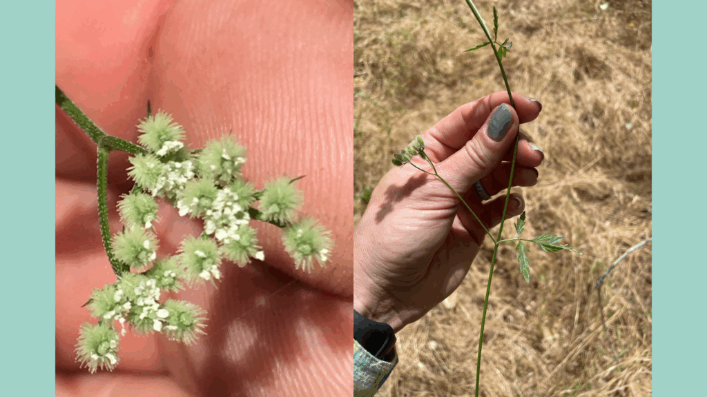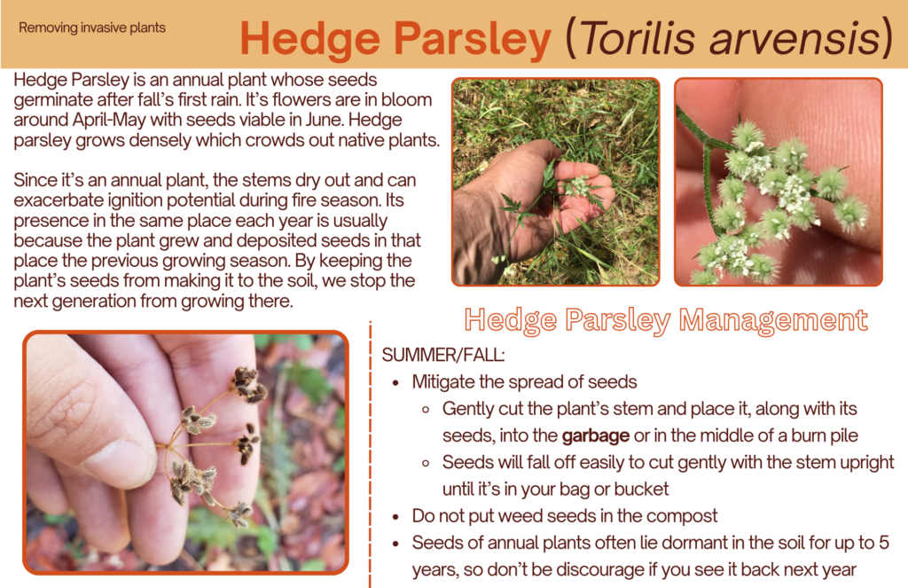 Have you ever taken a walk off the beaten path in the Sierra Foothills and found your shoe laces, socks, and maybe even your pants with plant seeds that stick like Velcro? If you have, then Hedge Parsley (Torilis arvensis) needs no introduction. Related to carrots, this little plant was introduced to North America via Europe and has spread tenaciously. Hedge Parsley is an annual plant whose seeds germinate after fall’s first rain. It’s flowers are in bloom around April-May with seeds viable in June. Hedge parsley grows densely which crowds out native plants. The seed pods are uncomfortable for people and animals which feel next to impossible to remove from clothing. Since it’s an annual plant, the stems dry out and can exacerbate ignition potential during fire season. We tend to find it in places with partial to full sunlight like the sides of trails, backyards, and garden planters.