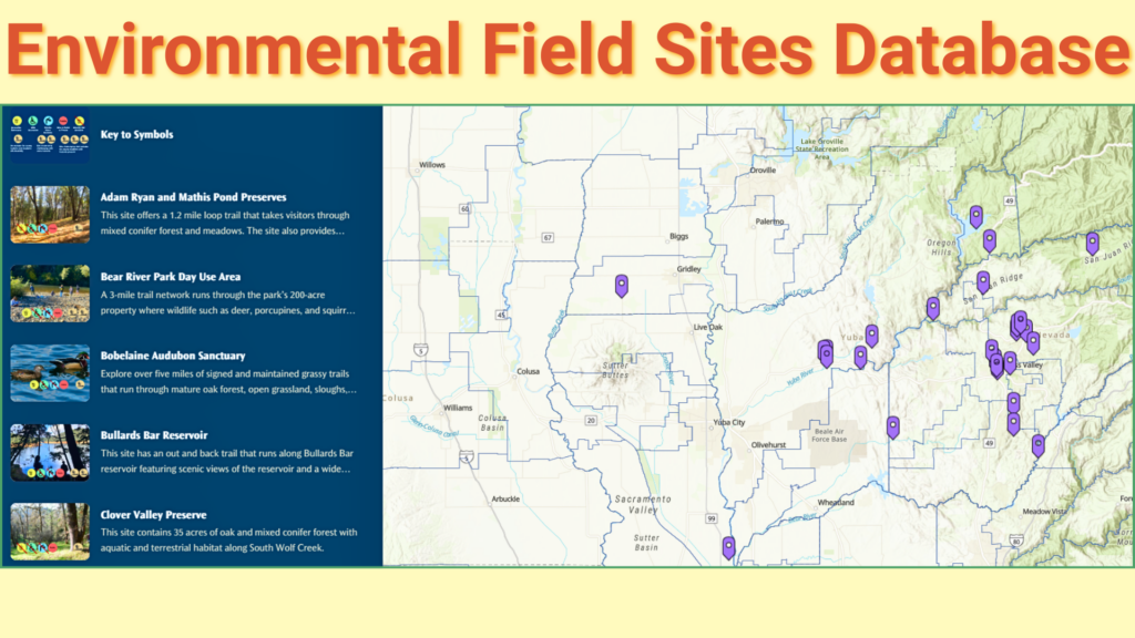 The Environmental Field Sites Database is a public, interactive resource designed to increase participation in outdoor environmental education by connecting teachers with accessible field sites and programs across Western Nevada and Yuba counties. The database includes detailed site information such as educational programming, safety and logistics, ecological phenomena, lesson resources, and connections to citizen science projects, all supported by in-person site assessments and partner collaboration. The database is publicly available as a comprehensive, user-friendly tool to help educators plan meaningful, safe, and inclusive outdoor learning experiences.