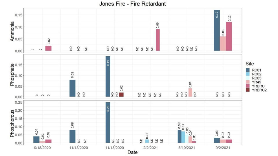 Laboratory analysis of water samples for ammonia, phosphate, and total phosphorus revealed that the sampled storm events did not cause a significant continuous influx of these compounds into Rush Creek and the South Yuba River. Although there were spikes of phosphate and phosphorus at one of the Rush Creek sites during the storm of Nov. 18, 2020 as well as elevated ammonia in the final baseline sampling, these levels were all below established Numerical Action Levels, so the presence of fire retardant in the watershed did not appear to have a continuous quantifiable impact on water quality during the sampling events.