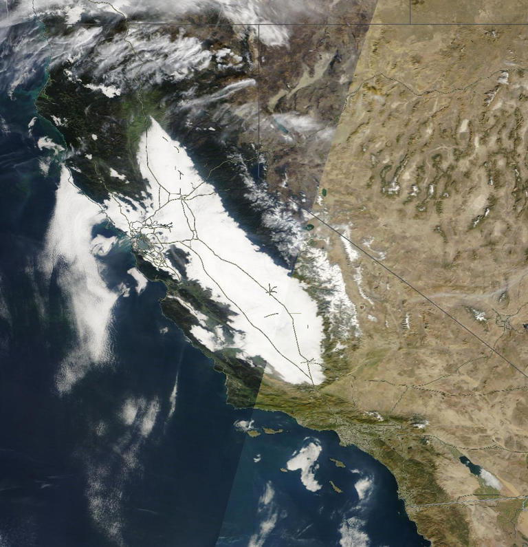A satellite image of Tule Fog in the Central Valley on November 23rd, 2025.