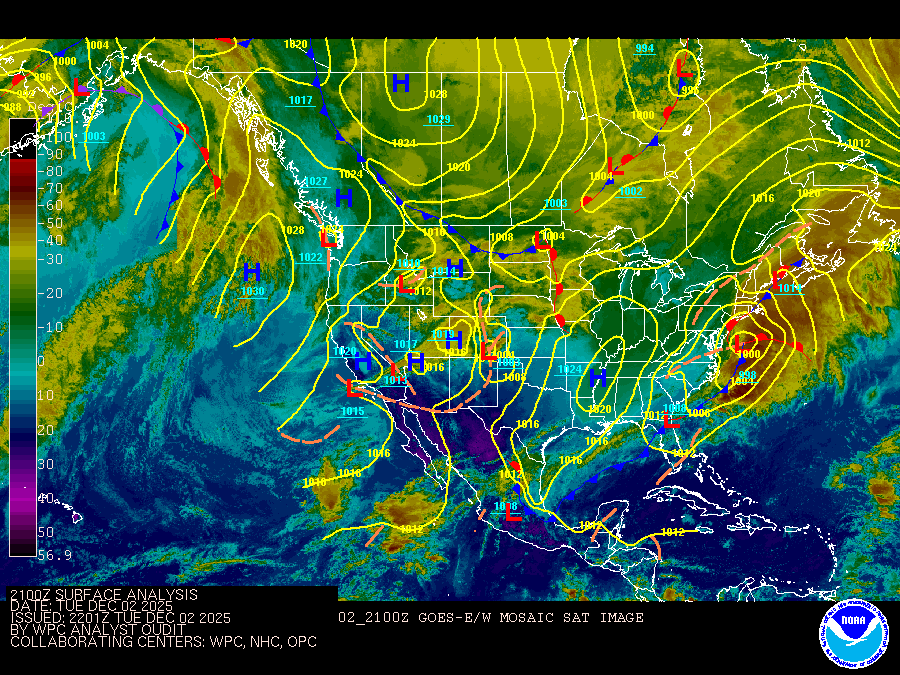 Pressure map from December 2nd. Note the high pressure ridge (H) out over the northern pacific and in the valley.
