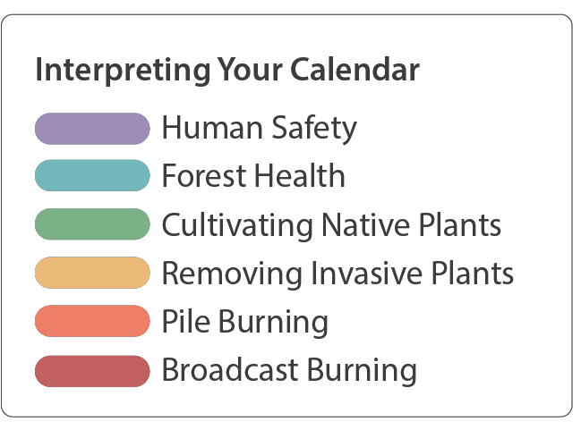 As residents of the wildland-urban interface (WUI), we have a responsibility to steward our lands to make them more resilient. This calendar was developed to inspire and remind residents of the ongoing stewardship actions that we can take. While the timelines illustrated here may seem defined, the exact timing of each management activity is a suggested guideline and subject to change based on the present conditions. This is not a comprehensive list of all you can do to manage your lands; instead, it is a starting point to help cultivate a healthy, resilient ecosystem and be prepared for the eventuality of wildfire.