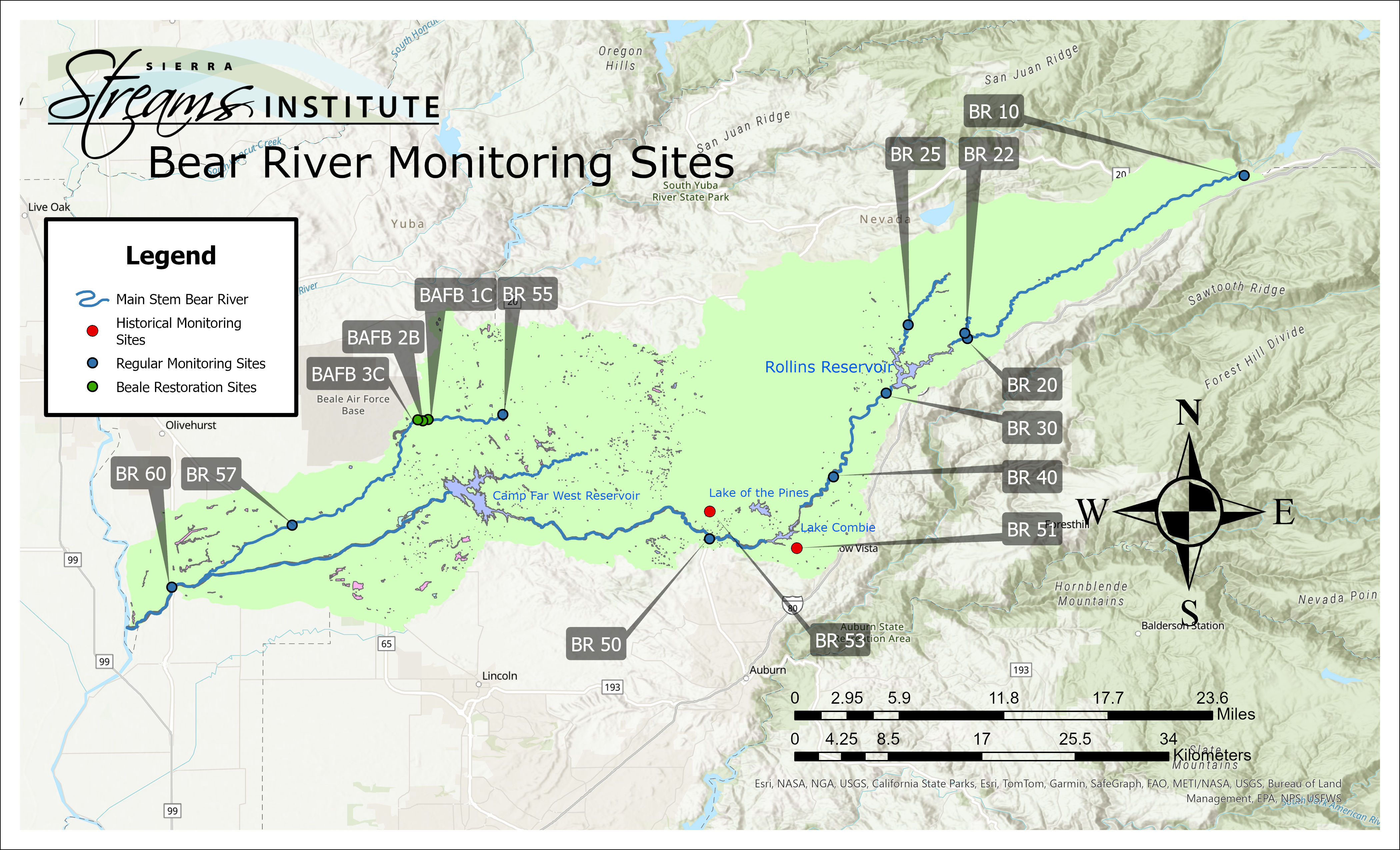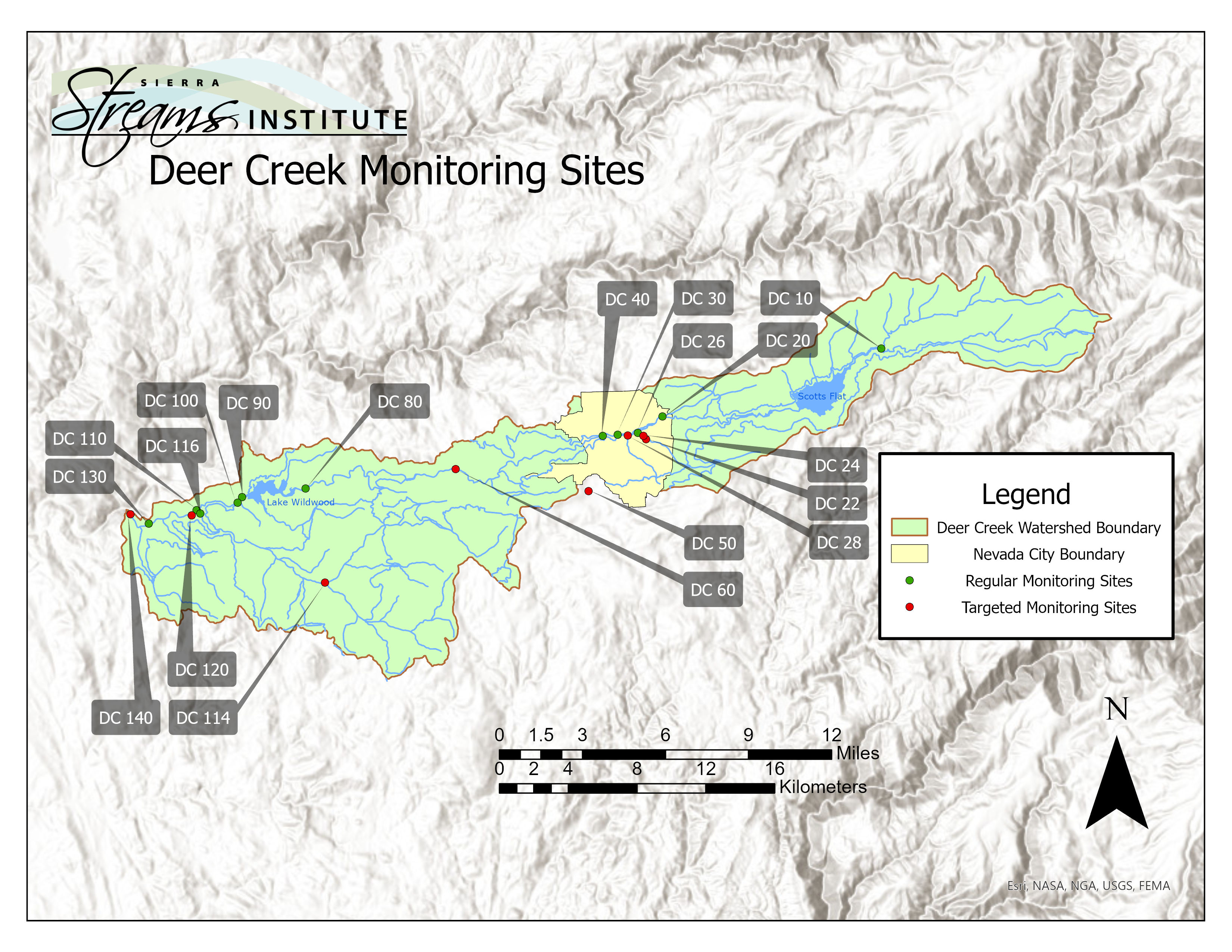 All of the land that drains into Deer Creek is the Deer Creek watershed. Deer Creek eventually flows into the Yuba River. All of the land that drains to the Yuba River is the Yuba River Watershed, which includes the Deer Creek Watershed. Below are maps of the Deer Creek Watershed and Bear River Watershed, including SSI’s monitoring sites.