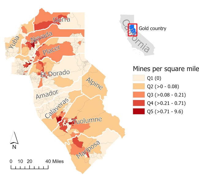 *Mine density was calculated using data from the Principal Areas of Mine Pollution dataset from the CA Department of Conservation, where mines of interest were those that mine(d) for Gold, Copper, or Chromium, and which did not include mine types to be of lower concern (e.g. quarry, gravel, and placer mines). Data are displayed as quintiles of selected mines per square mile by 2010 Census Block Group land area. Amador county does have minse but its data was not part of the PAMP dataset.