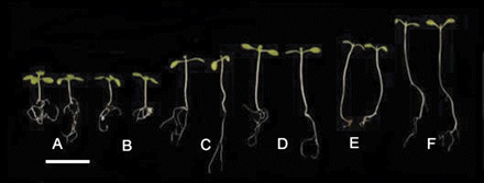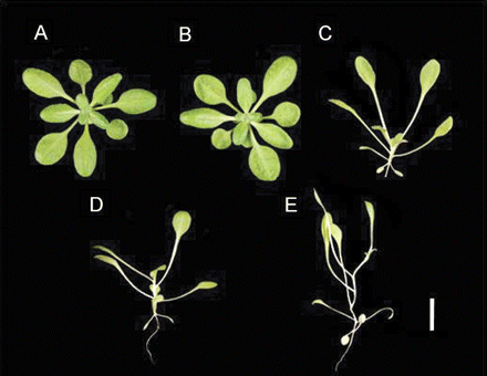 “Wild type” (A) and mutants of Arabadopsis with different phytochrome gene variants (B-E) grown in the same light environment demonstrating how phytochrome response to light changes growth forms. Photos reproduced from Franklin and Quail (2010), Phytochrome functions in Arabidopsis development.