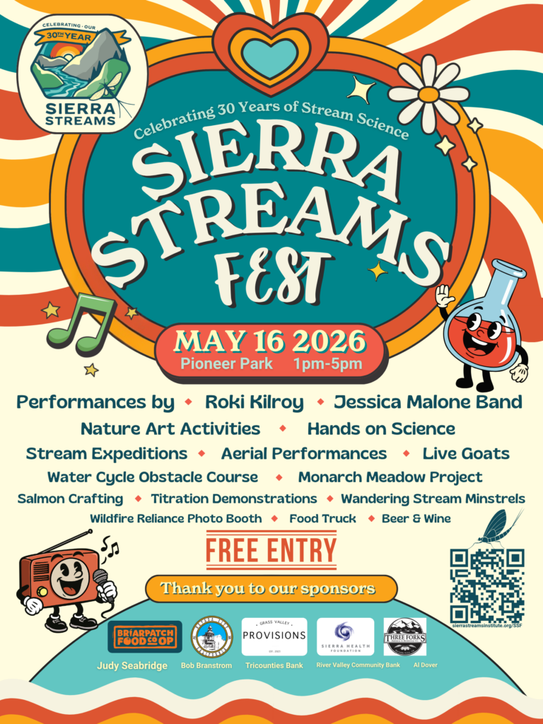 Sierra Streams Fest is a family friendly event hosted by Sierra Streams Institute in celebration of its 30th Anniversary. This event focuses on the connection between art, science and our community through meaningful experiences and partnerships, and opportunities to engage in hands-on activities and discussions around the science of where we live. Event attendees will learn about our holistic approach to environmental science, watershed monitoring, and forest ecology through hands-on activities and demonstrations. This event seeks to spark curiosity connecting the process of art and science by partnering with local science and art institutions with the hope of making science feel more approachable.