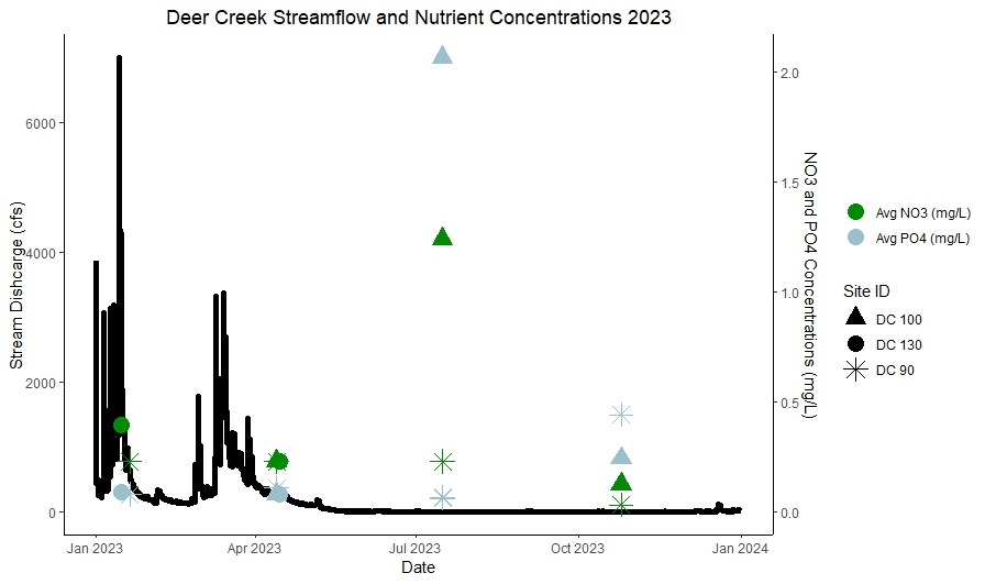 Figure 2: One year of flow in Deer Creek below Lake Wildwood, with nutrient levels plotted as well. In general, at lower flows we see higher levels of nitrates and phosphates.