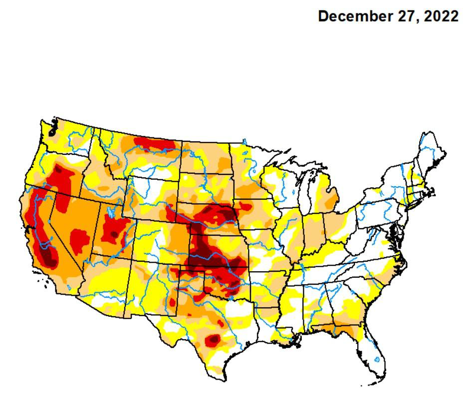 So what does all this mean for the drought? Well, the image on the left was drought severity as of December 27, 2022, while the image on the right is updated as of March 21st! While we still have some areas of moderate drought as we recover from multiple years of water drawdown, much of the state is now experiencing no drought. We can’t say how long this will last, as climate change makes California’s weather increasingly variable, but it’s nice to have a good water year!