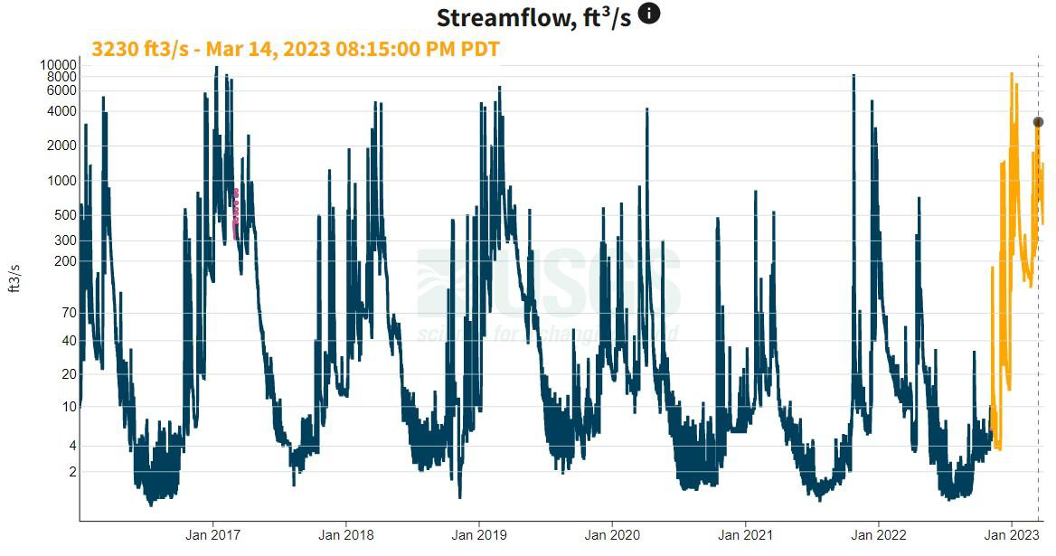 The figure above shows discharge (measured in cubic feet per second, ft3/s) in Deer Creek at the Smartsville gauge at Mooney Flat Rd., just above the confluence with the Yuba. As you can see, the continued rain has extended the period of high streamflow, and it’s looking a lot like the 2017 water year in the creeks! It will be interesting to see if this summer’s flows stay a little higher than the last few years, when groundwater levels were depleted and flows dipped to 1 ft3/s.