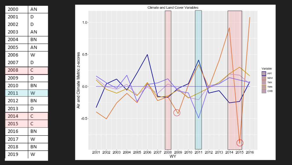 A graph of climate, land cover and water quality variables for water years 2001-2019. PPT=precipitation, NDVI=a measure of vegetation, TMX=max temperature, TMN=minimum temperature, CWD=climate water deficit (a measure of aridity). Critical drought years (C) are highlighted in red, while extreme wet years (W) are in blue. For other years, D=dry, AN=above normal, and BN=below normal. Climate data from CalBCM (http://climate.calcommons.org/bcm)